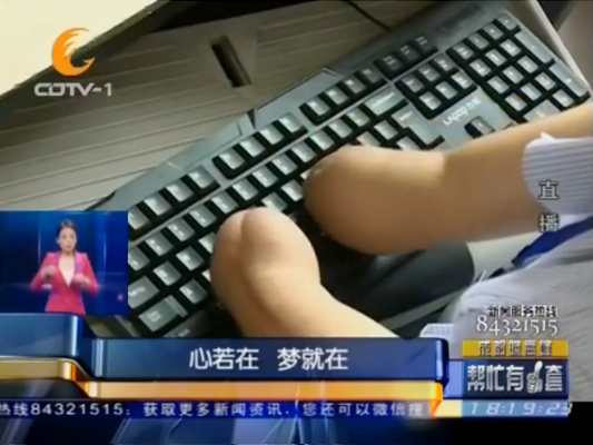 熊仁汀看到閃動的QQ后,熟練地用雙腳挪開椅子,雙肘迅速地敲擊著鍵盤,回復(fù)了信息。昨日,在雙流縣蛟龍港岷江路421號一間普通的辦公室里,沒有雙手的熊仁汀一連串熟練的動作,讓記者吃了一驚。