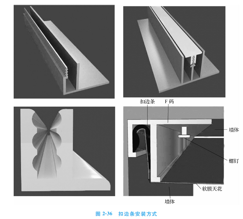 2、扣邊條安裝方式:首先根據圖樣設計要求,在需要安裝柔性軟膜吊頂?shù)乃礁叨任恢盟闹芄潭?圈40mm*40mm的支撐龍骨(可以是方林或方鋼管)。 在所有支撐龍骨固定完成后,在其固定安裝柔性軟膜吊頂?shù)目圻厳l(F碼,同- -構件)龍骨,如圖所示。