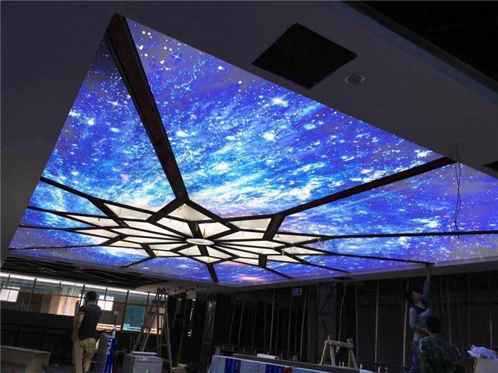 商場軟膜天花吊頂畫面UV噴印制作 柔性軟膜吊頂?shù)氖┕すに囍饕袃煞N:聚氯乙烯角碼安裝方式和扣邊條安裝方式。柔性軟膜吊頂進場前應保證場地通電,無建筑垃圾。所有燈箱有安裝前須做好燈架布置好線路并保證全部燈具線路通電明亮,安裝軟膜前如發(fā)現(xiàn)有燈具不亮要及時調整或更換。暗藏燈內部應涂白,以達到更好的效果??照{、消防管道等必須預先布置,安裝,調試并無問題。風口、噴淋頭、煙感器等應安裝完畢。