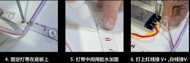 拼接完成后,安裝底板,安裝燈具。燈帶中間用膠水加固。底板一般為4毫米膠合板或白色油漆板(PVC)。膠合板涂油白色或貼錫紙,用于照明,以達到光源的均勻效果。