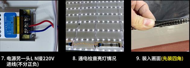 最后接通電源,接通電源,檢查照明情況。安裝圖片時,注意先安裝四角,將四角及軟膜中部安裝在鋁合金卡槽內(nèi)。