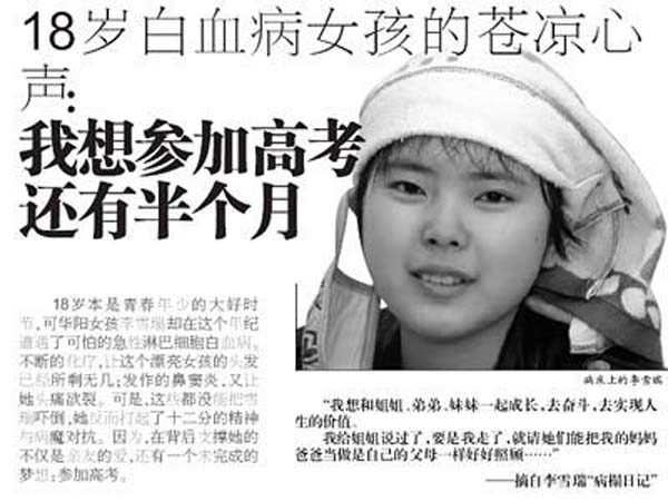 參加高考是雪瑞的最大夢想。雪瑞說“高考,對于十年寒窗苦讀的我是一個最好的檢驗;高考,對于身患白血病的我來說,不能像其他學(xué)生一樣坐在考場完成;高考,對于生命存續(xù)間的我多么重要,如果不能參加高考,這是我的遺憾。” 2011年5月,雙流縣招辦得知雪瑞的情況后,主動同雪瑞就讀的學(xué)校-- 雙流縣藝術(shù)體育實驗中學(xué)取得聯(lián)系,銜接病房高考事宜。出于雪瑞的身體等多方面考慮,最終雪瑞未能如愿參加高考。