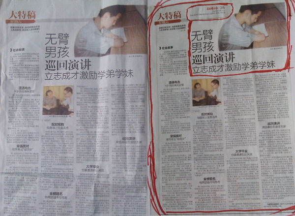 2012年7月14日星期六,華西都市報第28版大特稿刊登了《無臂男孩巡回演講立志成才激勵學(xué)弟學(xué)妹》的文章。在2003年高考完畢,熊仁汀(原名熊仁葛)就被華西都市報、新華社、成都商報、成都晚報、香港文匯報等采訪報道了他在9歲時遭遇電擊,痛失雙臂后,通過父母、老師、同學(xué)的幫助和自己的努力,戰(zhàn)勝重重困難,重新堅強(qiáng)地面對生活和學(xué)習(xí),靠著堅韌的毅力克服了一般人不能克服的種種困難,以高出當(dāng)年本科錄取線51分的好成績考入了西南石油大學(xué),激勵了無數(shù)的學(xué)弟學(xué)妹去實現(xiàn)他們的大學(xué)夢想和人生追求!