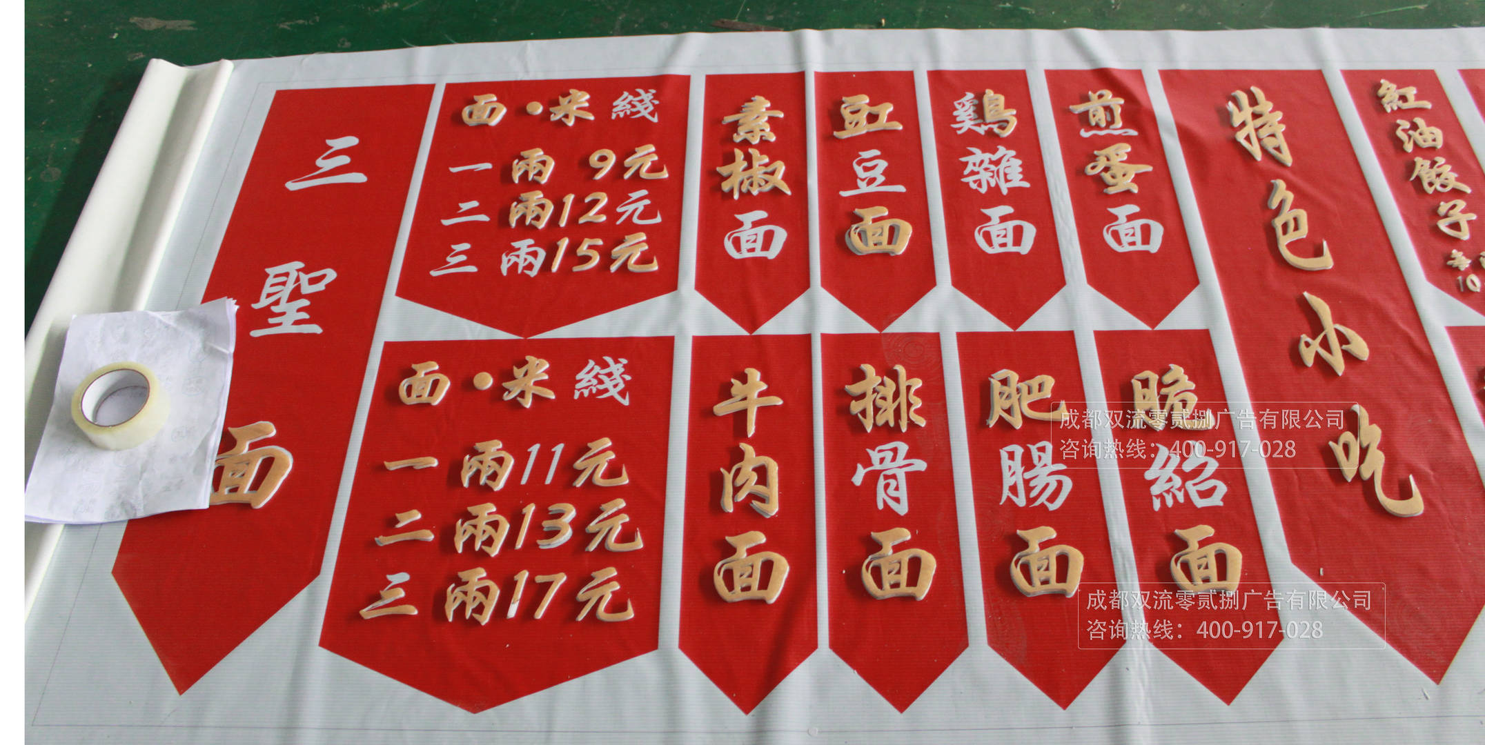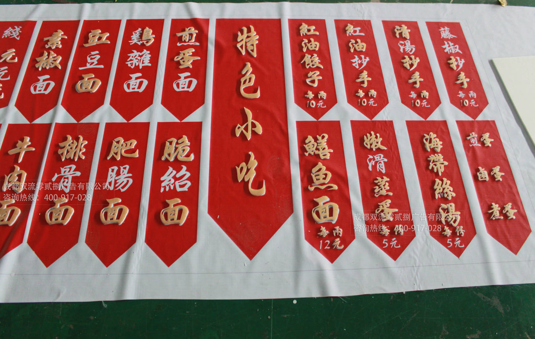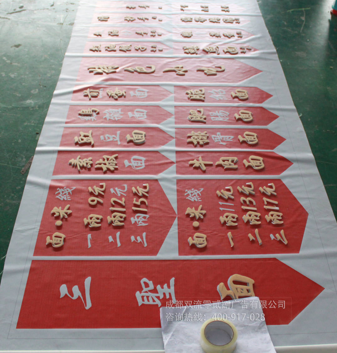 底部是運用了厚實的噴繪布能夠讓裝飾品更有質(zhì)感,紅色部分采用了成都零貳捌廣告公司的UV噴繪,并且字體是運一種設計師廣泛運用的亞克力的材質(zhì),人工雕刻打磨而成,整個裝飾顯得質(zhì)感和設計感十足。