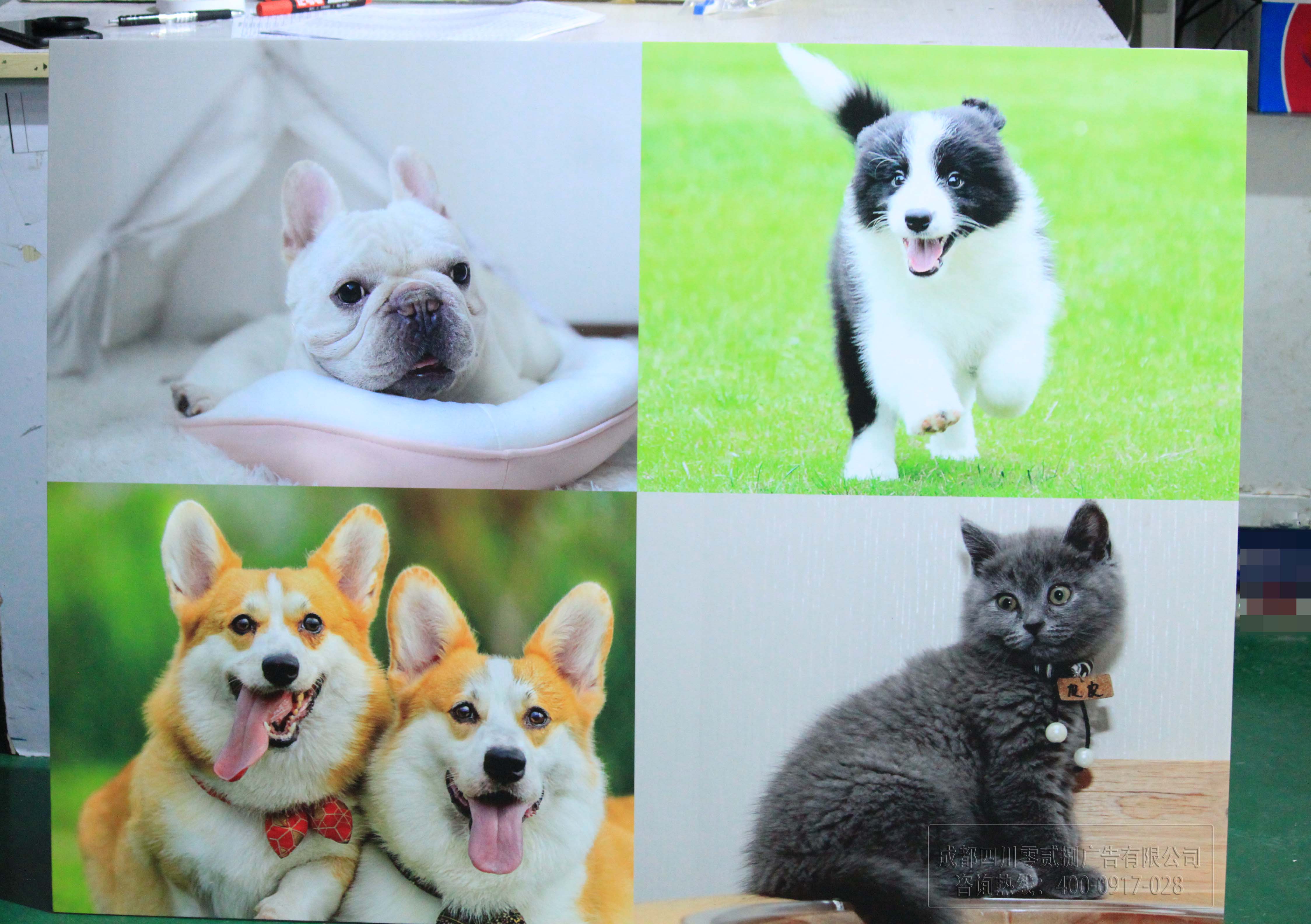 加上UV噴繪上色,圖案、照片噴繪還原度是很高的,照片采集自028廣告公司制作的寵物店KT板顏色鮮艷,圖案清晰;KT材質(zhì)輕盈,可見寵物照片還原度高,活靈活現(xiàn)。