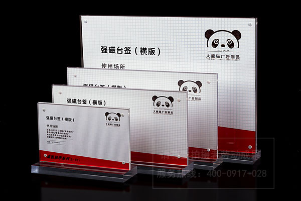 常見的臺簽多是亞克力做的,亞克力折彎造型,雙層,內(nèi)有插槽,可隨時更換內(nèi)容。也有的為了突出品質,采用亞克力背面絲印,背面烤漆,然后熱彎的工藝。由于亞克力的質感比較強烈,光澤度較高,觀感較好,能很好地突出品質感,所以采用亞克力制作的臺簽最多見。除了亞克力,有些臺簽是用鋁型材制作,這種臺簽比較便宜,使用也比較方便,但是檔次看起來要差一些。