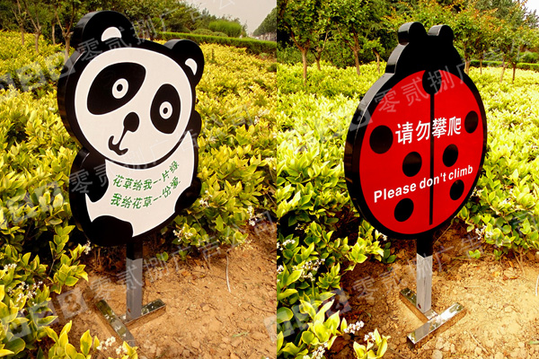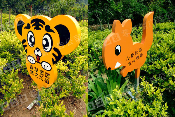 花草牌一般造型多樣,美觀可愛,有動(dòng)物造型,有花草造型,還有各種設(shè)計(jì)元素造型等。色彩多數(shù)也比較艷麗,為了能在花草叢中凸顯出來(lái),顏色多為暖色為主?;蚋鶕?jù)該單位來(lái)的標(biāo)準(zhǔn)色來(lái)決定色彩。